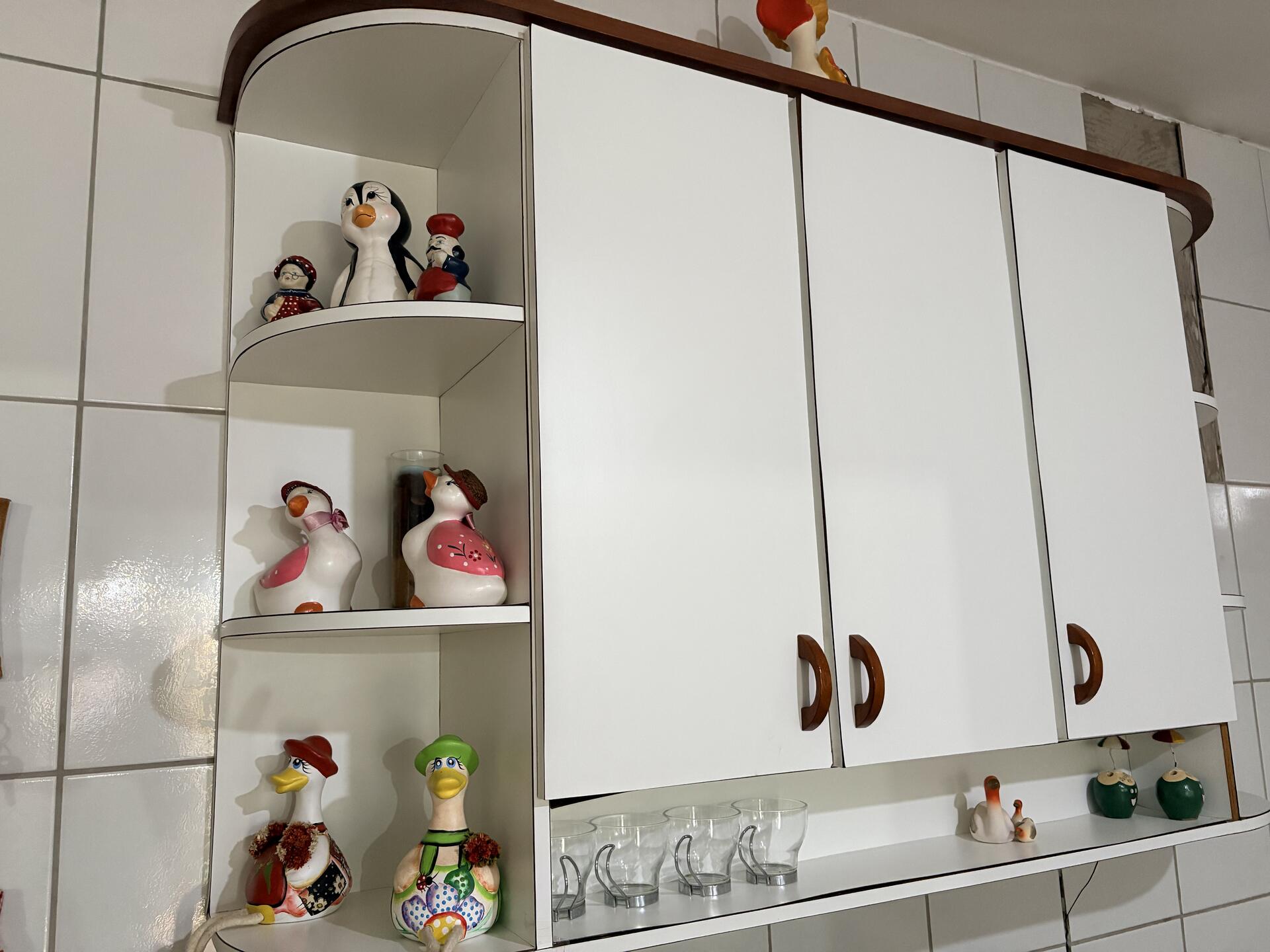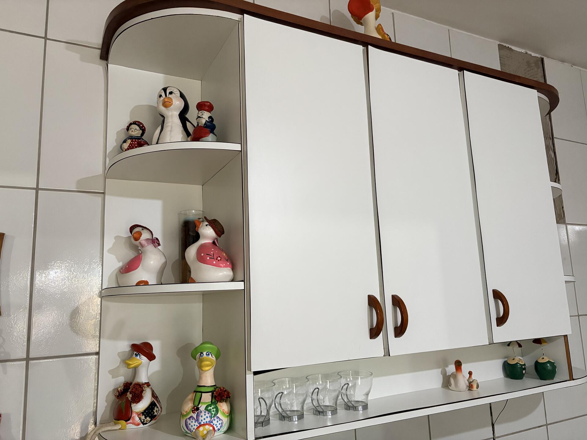 Armário de cozinha branco com detalhes em madeira e nichos laterais abertos + vários objetos decorativos e utensílios.