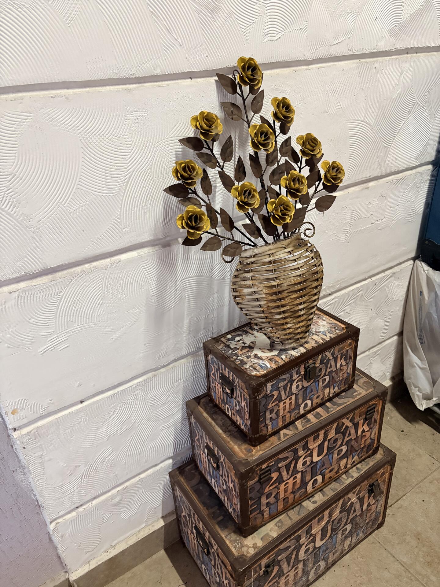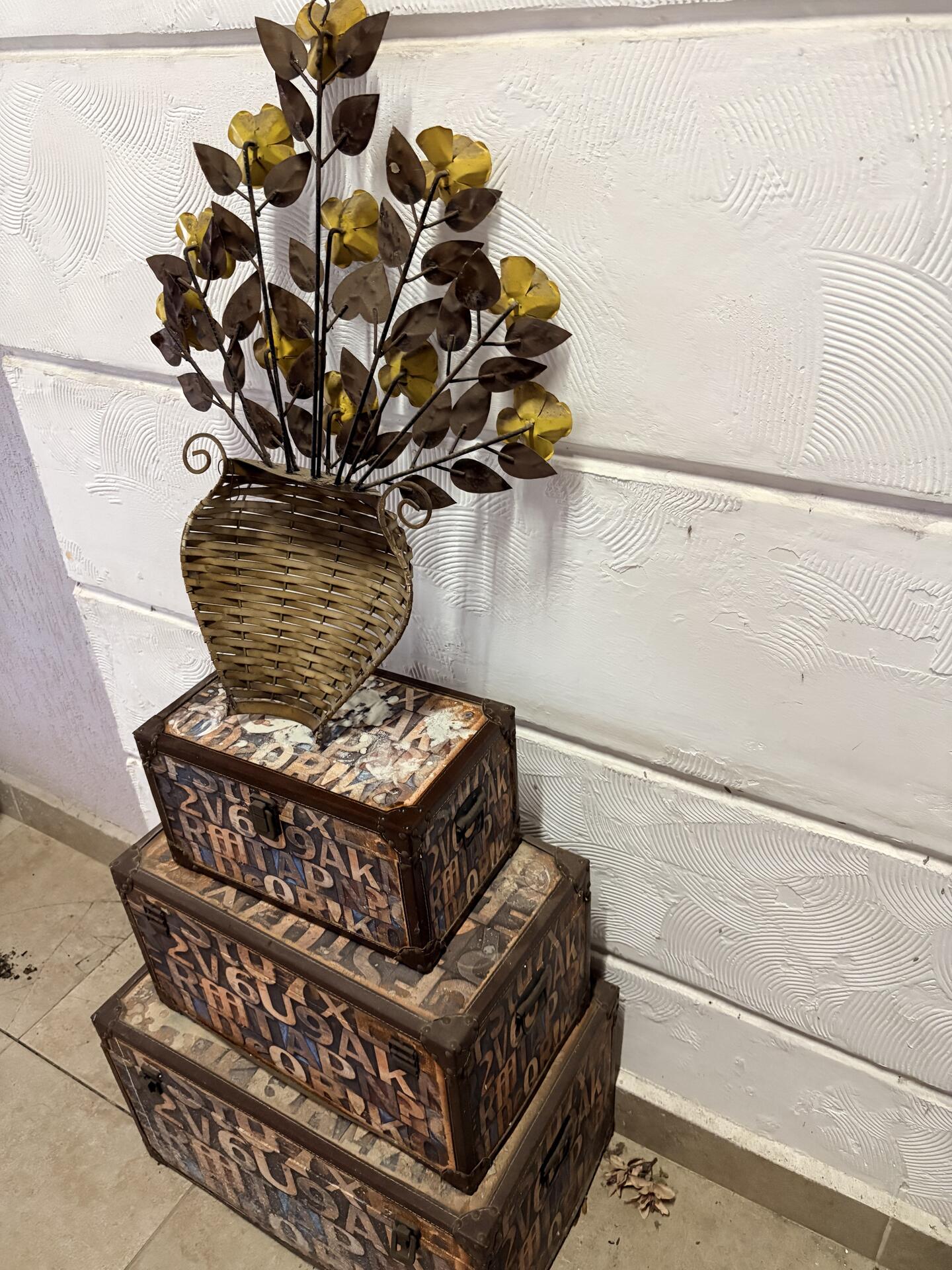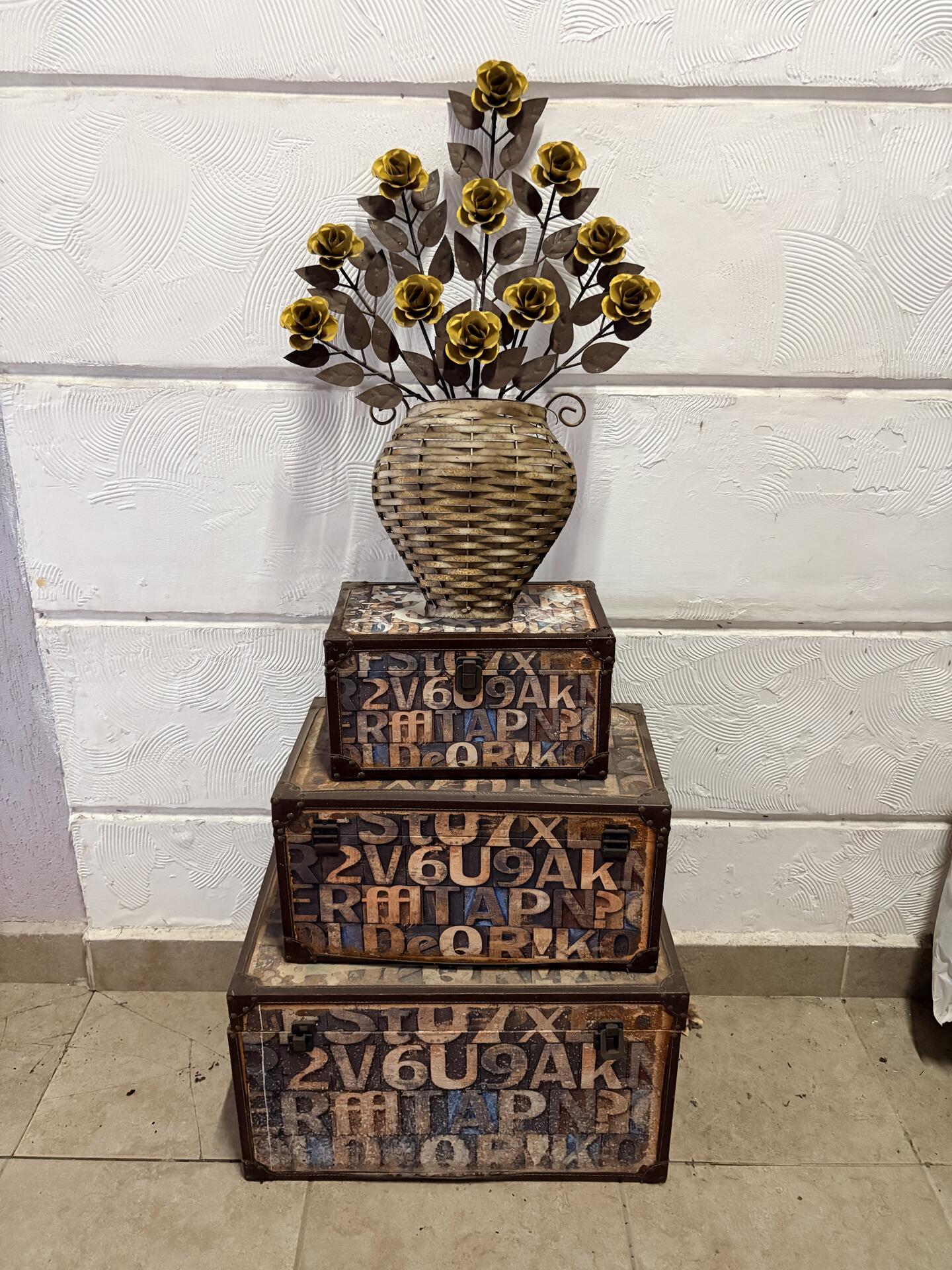 3 Baús decorativos (tamanhos diferentes) Estilo vintage / retrô + Arranjo decorativo de parede Flores metálicas douradas