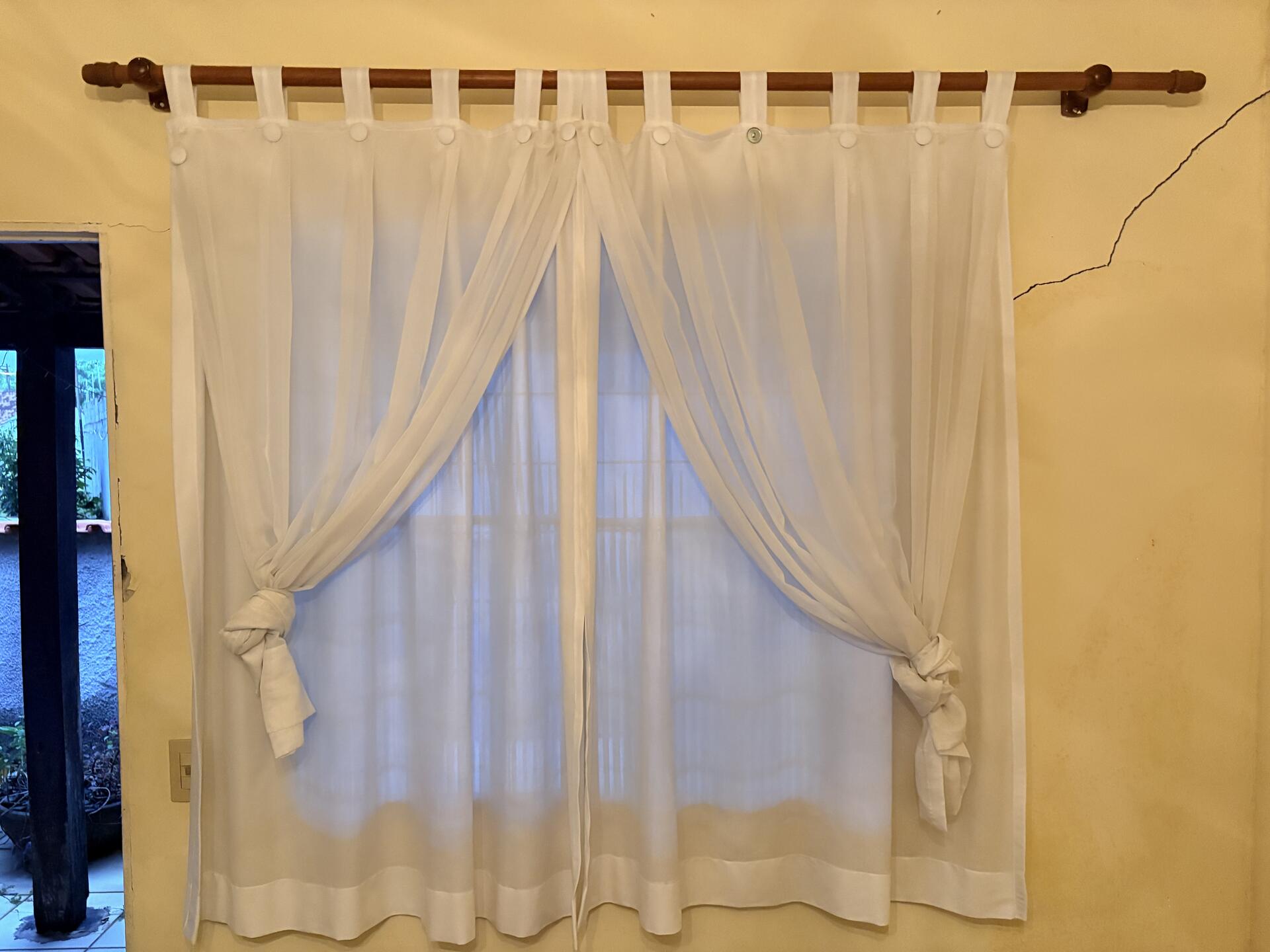 Kit Cortina Completo – Elegante + Varão de madeira, Cortina branca em voal (tecido leve e delicado), Varão de madeira cor madeira natural, suportes inclusos, pronto para instalar.