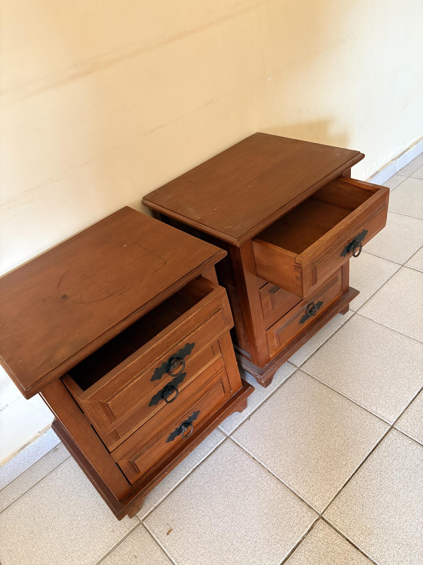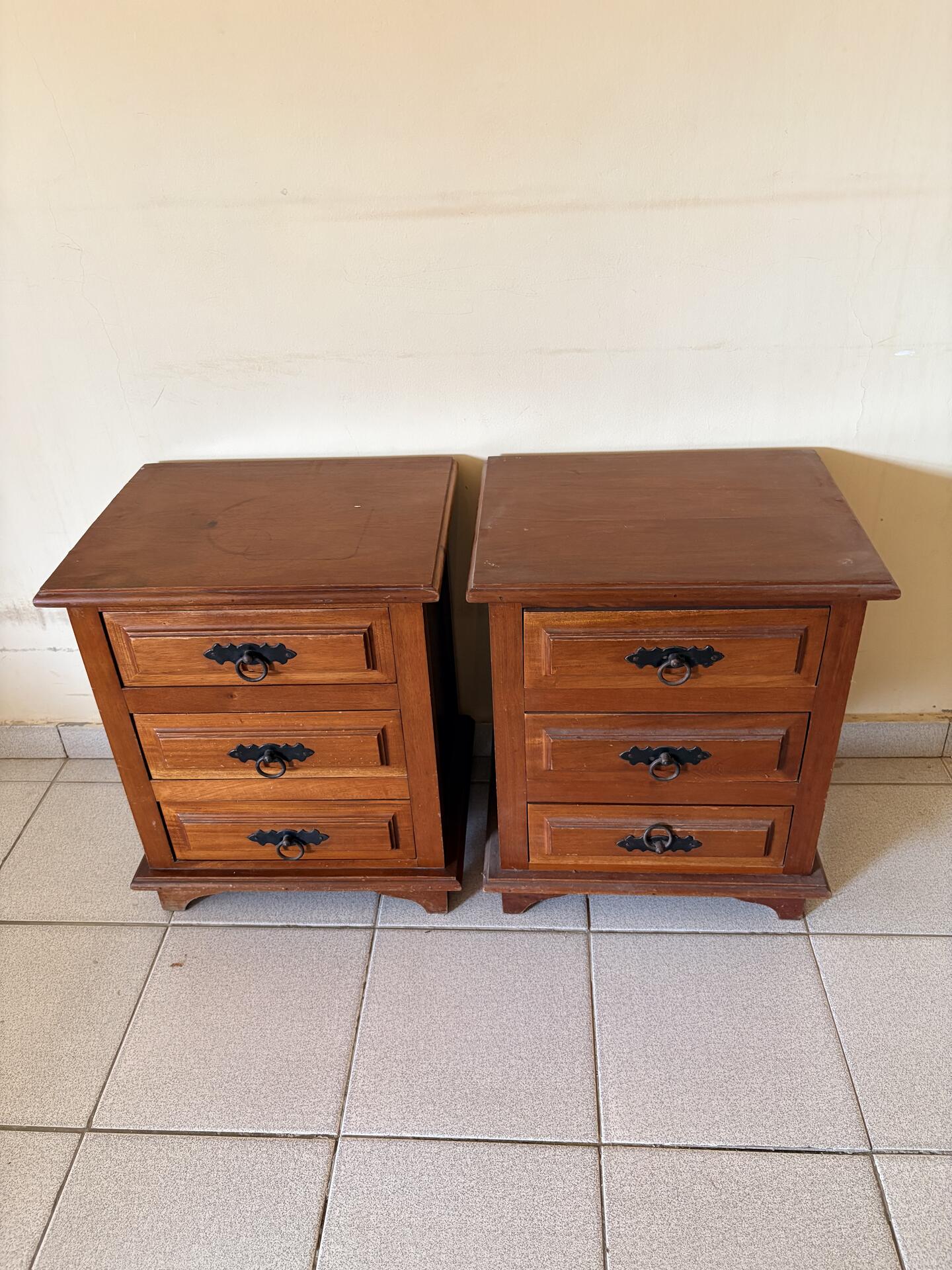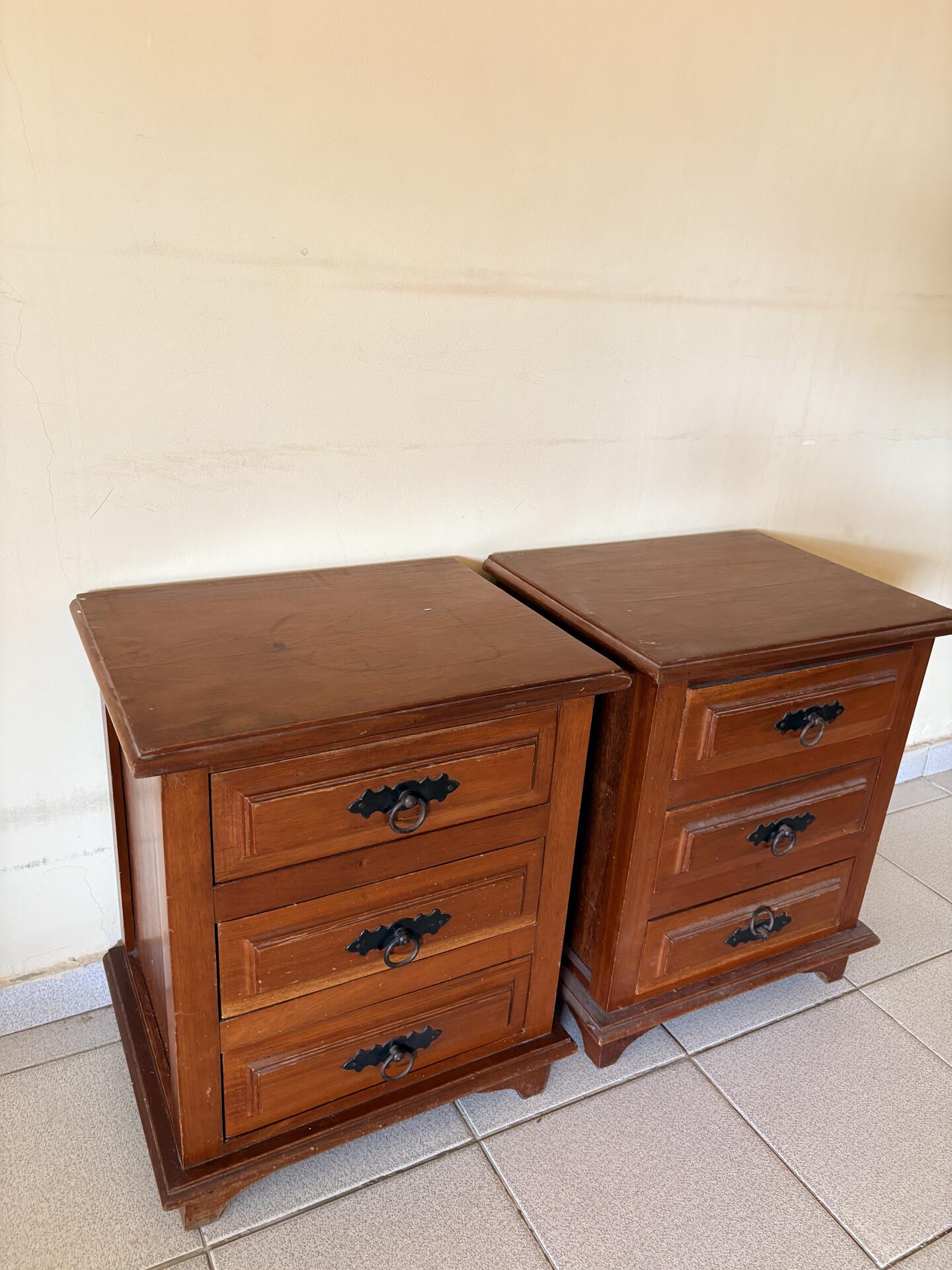 2 criados-mudos (mesas de cabeceira) em madeira maciça, no estilo rústico/clássico Cor amadeirada em tom mel, cada peça possui 3 gavetas espaçosas, puxadores de metal preto com argolas, estilo colonial, estrutura robusta e pés levemente elevados.